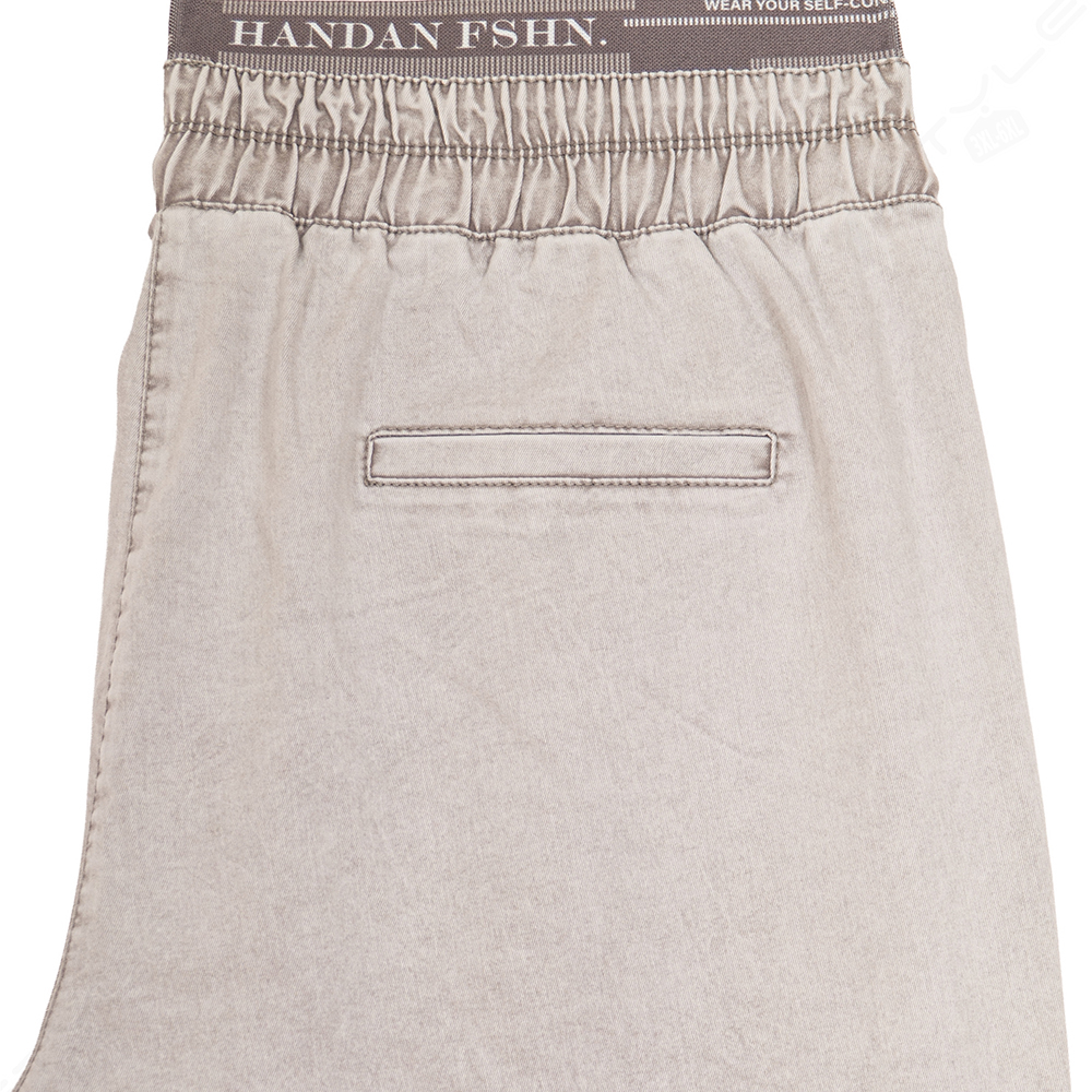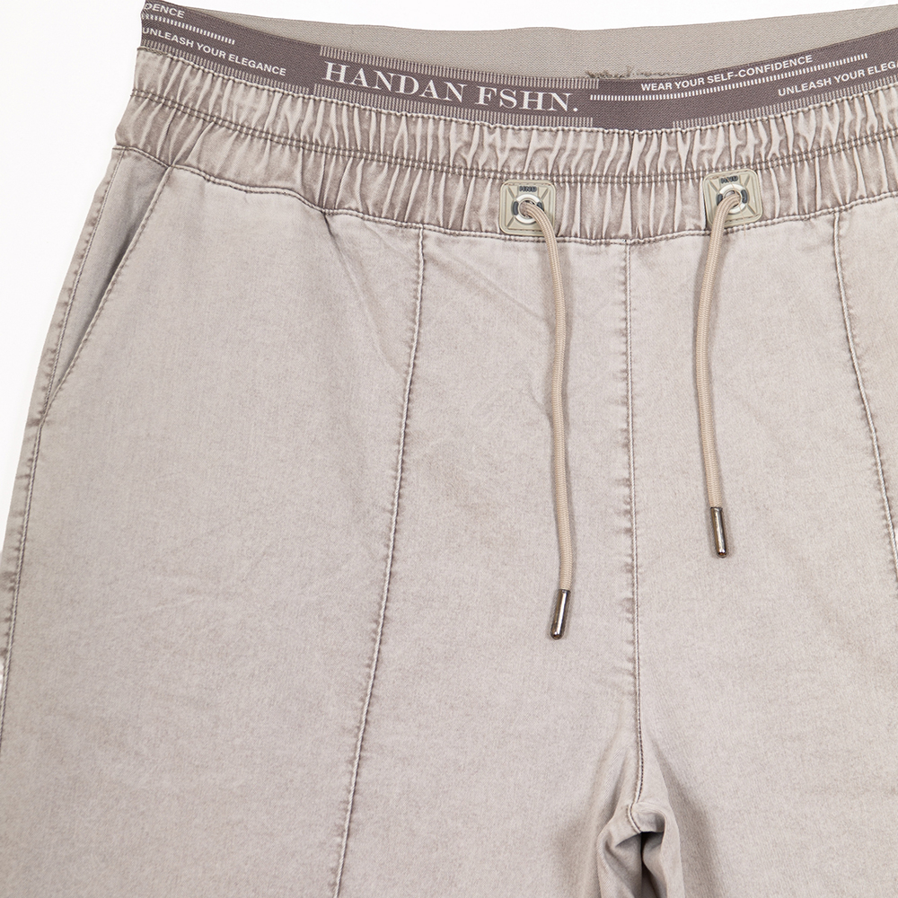 Покрой прямой, слегка заужены к низу, пояс на широкой резинке со шнурком, впереди есть два кармана, сзади два кармана-обманки.