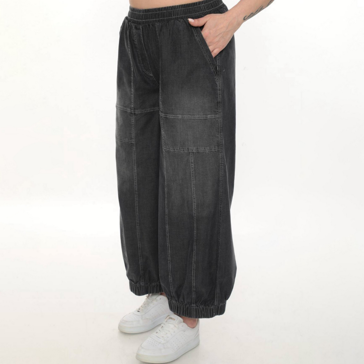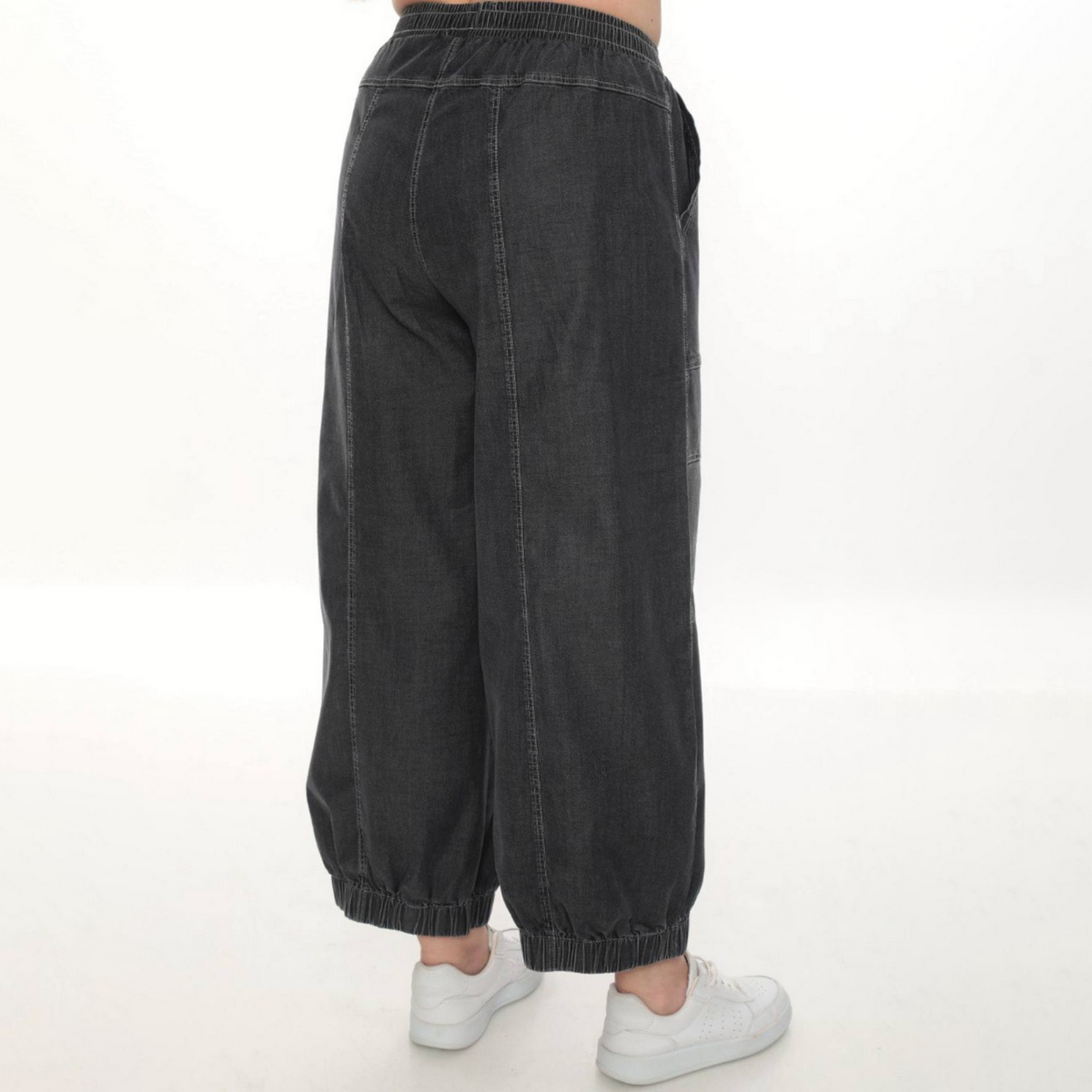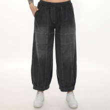 Фасон свободный, пояс на широкой резинке без молнии, впереди есть два кармана, сзади карманов нет, низ калоши на резинке.