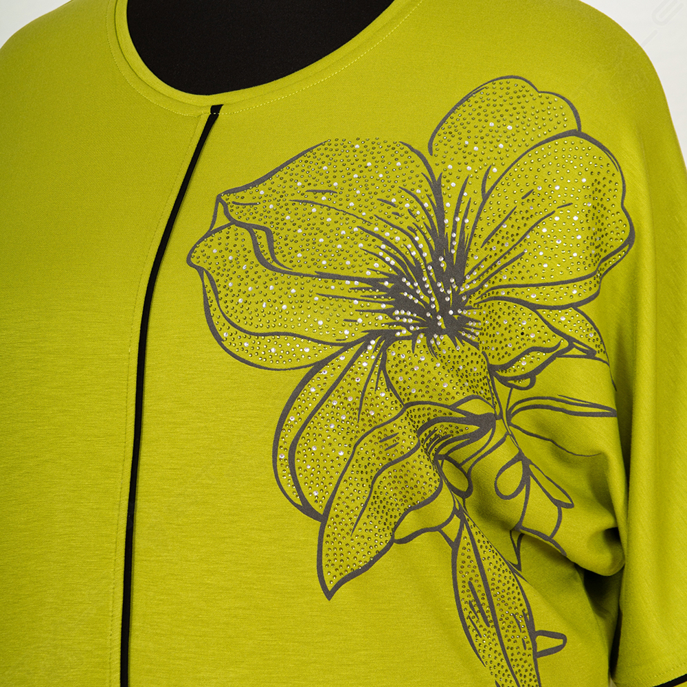 Фасон прямой, рукав короткий, горловина круглая.