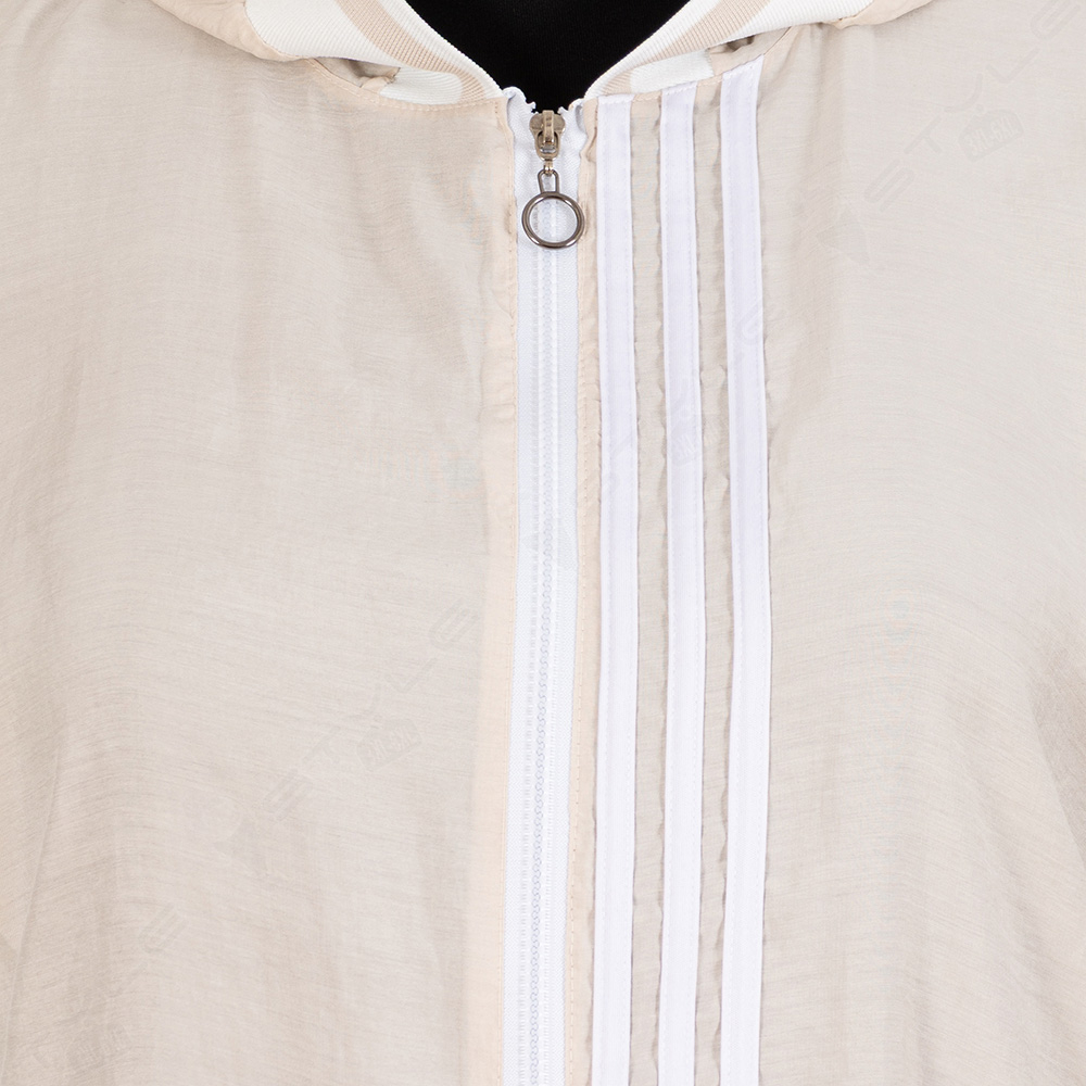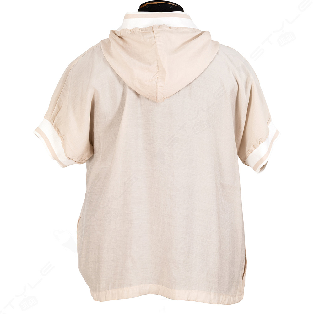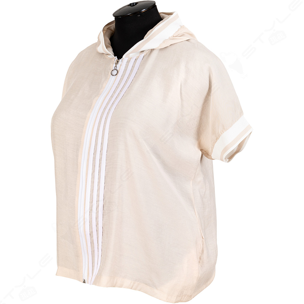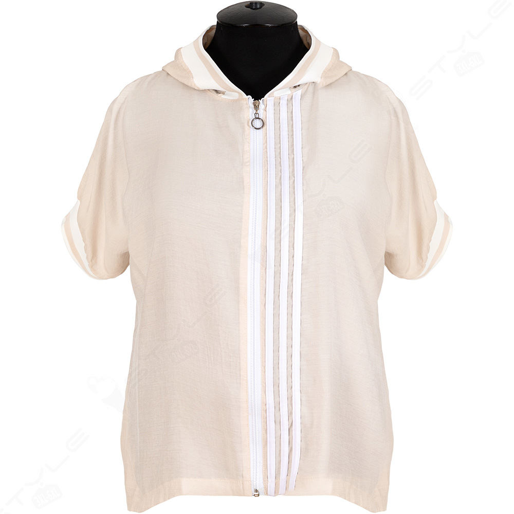 Фасон блузона - свободный, рукав короткий, с капюшоном, на молнии, по бокам есть карманы.