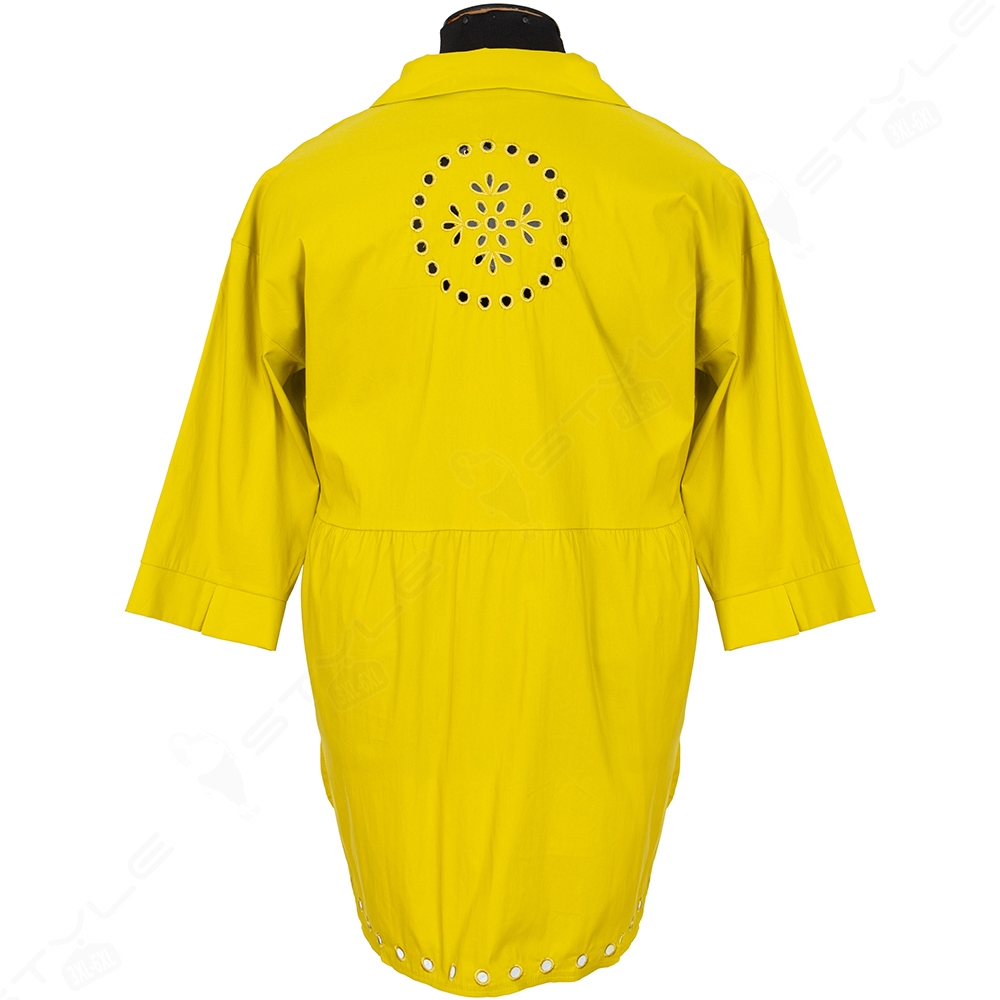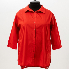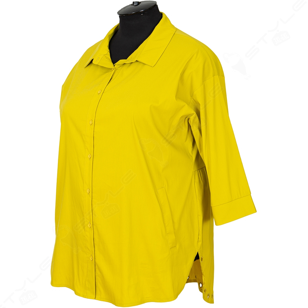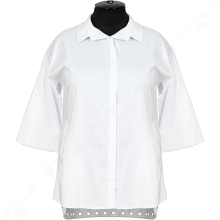 Фасон прямой, горловина рубашечного типа, рукав 3/4, полностью застегивается на пуговицы, по бокам есть два кармана.