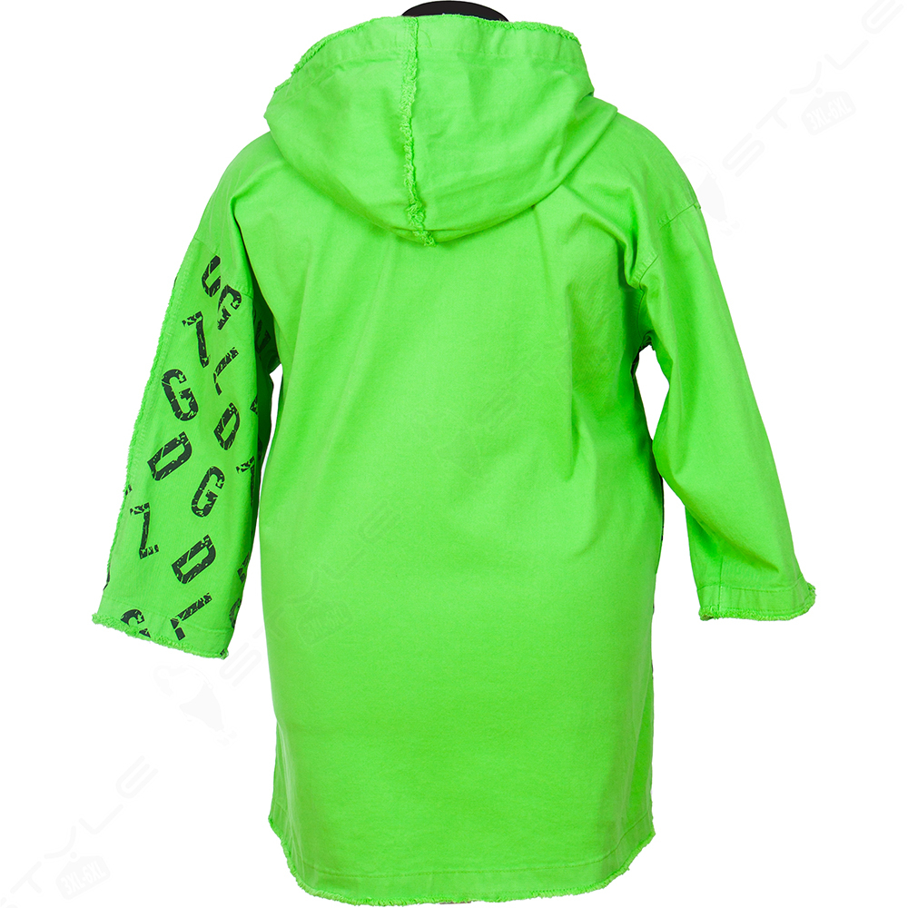 Фасон прямой, есть два кармана, с капюшоном, рукав длинный.